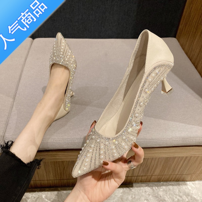 SUNTEK高跟鞋女2023年新款春秋季百搭法式少女尖头浅口细跟气质水钻单鞋