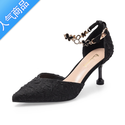 聚范洋气新款黑色3cm猫跟鞋浅口日常尖头钻链5厘米高跟鞋单鞋女不累脚