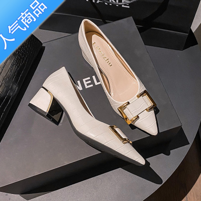 聚范轻奢方扣高跟鞋女细跟黑色工作鞋尖头单鞋2024夏季新款气质女范