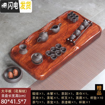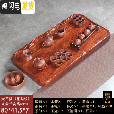 三维工匠茶盘家用花梨黑檀木整块实木功夫茶具套装排水茶台茶海长方形简约 大平板-花梨纹(红紫砂套装)