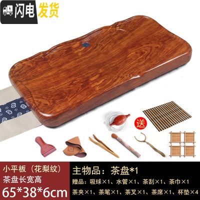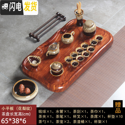 三维工匠茶盘家用花梨黑檀木整块实木功夫茶具套装排水茶台茶海长方形简约 小平板-花梨纹(钧瓷套装)