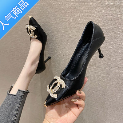 SUNTEK鞋子女2023春夏新款高跟鞋软皮尖头细跟职业时尚黑色洋气女式单鞋