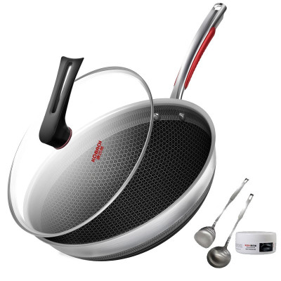 悦厨炒锅32cm送铲勺清洁膏 康巴赫炒锅悦厨蜂巢双面不粘锅316L不锈钢炒菜锅32cm电磁炉燃气灶通用