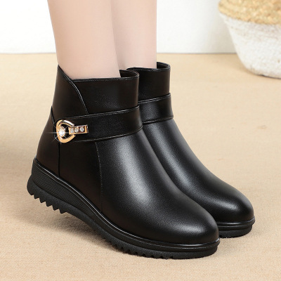 厂家直销热卖牛皮女棉鞋圆头平底软底妈妈女鞋加厚中老年女棉靴
