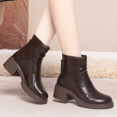 加厚棉靴粗跟圆头防水台后拉链骑士靴