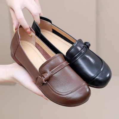 真皮粗跟深口复古女单鞋圆头软底四季一脚蹬低跟单鞋25休闲妈妈鞋