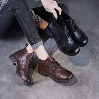 复古中跟真皮马丁靴女秋季新款舒适粗跟系带短靴小牛皮时装靴