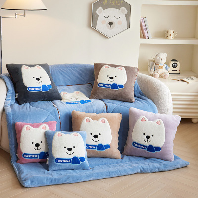 新款加厚牛奶绒围巾熊贴布绣抱枕被两用二合一车载沙发午睡靠垫被