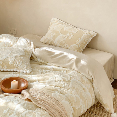 高级感奶色花绒牛奶绒四件套保暖加厚双面珊瑚绒床用冬季防静