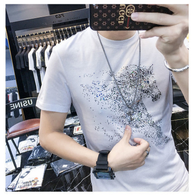 欧洲站男士短袖T恤夏季新款潮牌修身圆领烫钻印花半袖体恤衫