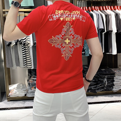 男士夏季欧洲站新款个性潮流重工丝光棉大V烫钻字母修身短袖T恤男