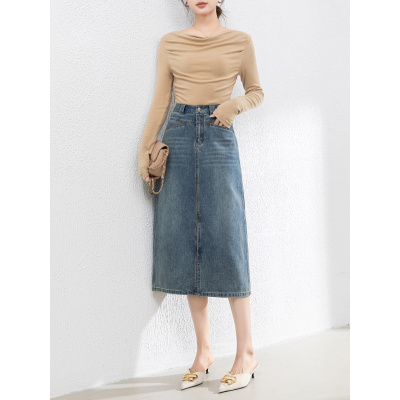 开叉牛仔半身裙女秋季新款高腰A字中长裙复古显瘦宽松裙