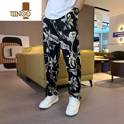 YANXU夏季薄款直筒裤男士时尚百搭透气冰丝休闲裤潮流民族风宽松运动裤