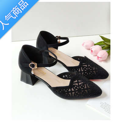 SUNTEK中空包头凉鞋女网纱水钻一字扣中年女鞋夏季粗跟镂空透气妈妈单鞋