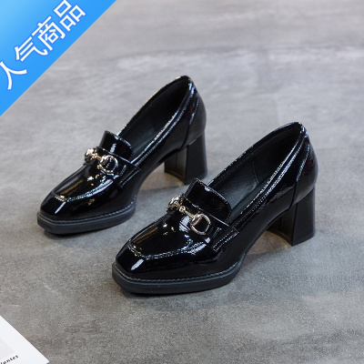SUNTEK单鞋方头中高跟鞋粗跟厚底乐福鞋女2023年新款夏季亮皮女鞋子