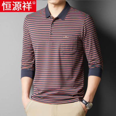 恒源祥长袖t恤男士Polo衫中老年条纹爸爸装春秋薄款宽松口袋上衣