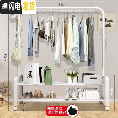 三维工匠简易晾衣架落地折叠卧室内挂衣架家用单杆式晾衣杆网红挂衣服架子 150cm-白双层+防风钩+双侧钩+轮 1个