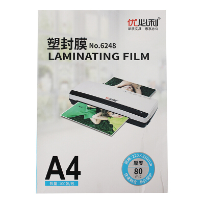 优必利 护卡膜/塑封膜 透明高清照片塑封膜 相片护卡膜 过塑膜 A4 厚80mic/100张 6248