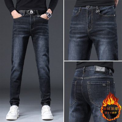 欧货高端蓝色牛仔裤男秋冬季加绒潮牌修身简约弹力小脚休闲长裤男