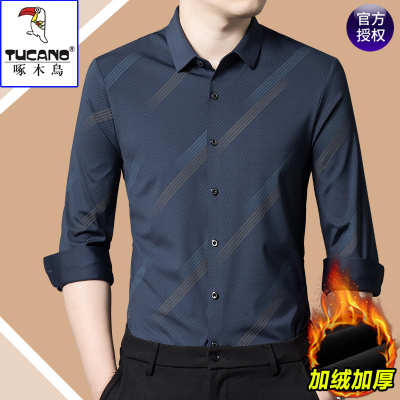 啄木鸟男士长袖抗皱衬衫中年休闲加绒加厚爸爸秋冬季保暖条纹衬衣