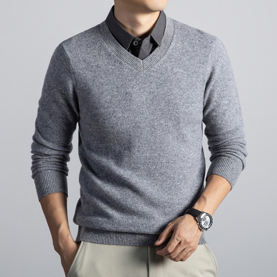 加厚400g纯羊毛假两件毛衣男秋冬季新款翻领打底羊毛衫男