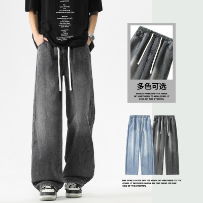高街松紧腰男士牛仔裤宽松直筒阔腿裤抽绳设计潮流百搭休闲牛仔裤
