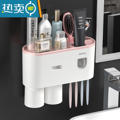 三维工匠家用卫生间牙刷牙膏架置物架电动牙刷收纳盒套装情侣免打孔牙具座 粉色大号