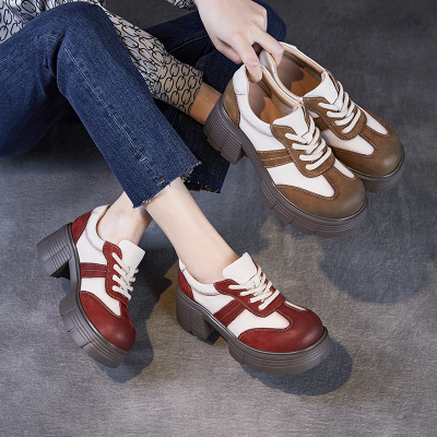 厚底复古拼色休闲单鞋女款头层牛皮圆头系带低帮高跟单鞋