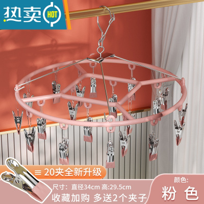敬平不锈钢家用袜子衣架多功能晾晒衣夹挂钩圆形凉内衣架短裤夹子器 硅藻胶圆形晾晒架粉色(20夹) 1个