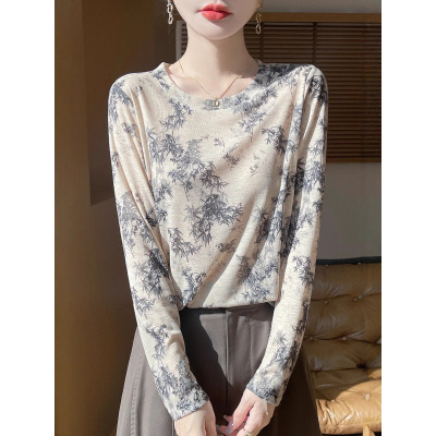 水墨细绒圆领长袖莱塞尔天丝蝶恋花印花宽松时尚上衣新款洋气打底