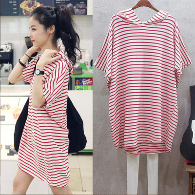 夏季新款韩版女装连帽蝙蝠袖短袖T恤裙宽松条纹中长款T恤女潮
