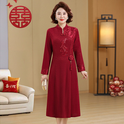 新款女装刺绣款中老年人婚宴连衣裙气质婆婆装长裙子喜庆妈妈春秋