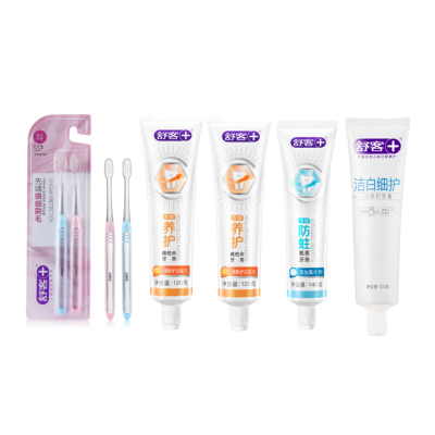 舒客+ 小苏打洁白细护牙膏120G+维C营养牙膏120G*2+舒客专效防蛀固齿牙膏140g+舒客专效特护牙刷2支