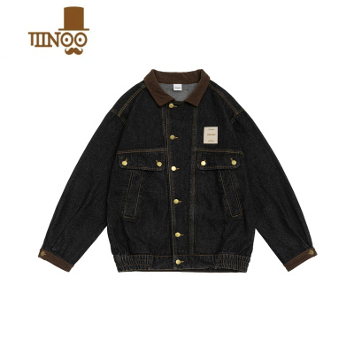 YANXU设计感黑蓝拼接牛仔外套男士痞帅欧美风街头水洗翻领夹克上衣