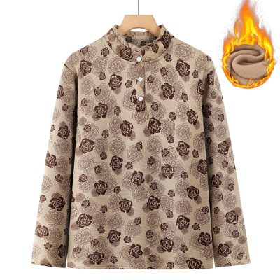 印花款女装中老年妈妈装打底衫时尚半开领加绒保暖上衣中年人小衫