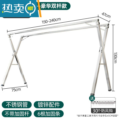 敬平晾衣架落地折叠升降室内伸缩免打孔户外防风宿舍铝合金阳台晾衣架 超厚不锈钢2.42M双杆+30风勾 大