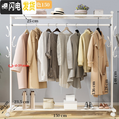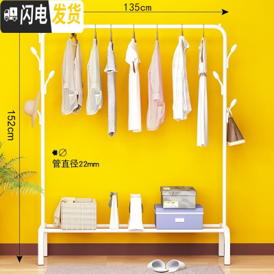 三维工匠单杆晾衣架落地卧室折叠晒衣架家用凉衣服被子简易室内 150cm-白色双杆+双层置物网+双衣帽钩+送晾衣架配件