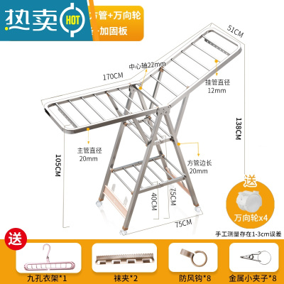 三维工匠晾衣架落地折叠卧室内外家用阳台晒床单被子凉衣杆不锈钢伸缩 加厚不锈钢豪华款2.0米(防风勾) 大晾衣架配件