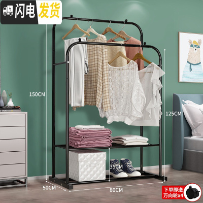 三维工匠晾衣架落地挂衣架折叠宿舍用室内卧室学生晒衣架家用凉衣服杆架子 推荐款-黑125[置物架+双侧钩+万向轮晾衣架配件