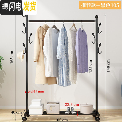 三维工匠晾衣架落地折叠室内单杆式晒衣架卧室挂衣架家用简易凉衣服的架子 推荐款-黑105[置物架+双侧钩+万向轮晾衣架配件