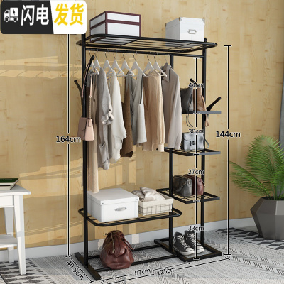 三维工匠简易挂衣架落地卧室阳台晾衣架折叠置衣帽架凉衣服杆 125cm-黑-创意豪华款[上下双层置物网+侧三层置晾衣架配件