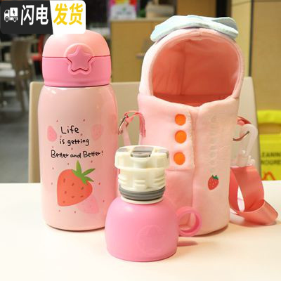 三维工匠儿童保温杯带吸管学生316不锈钢水杯斜挎可背水壶 宝宝户外吸管杯 草莓500双盖送布套