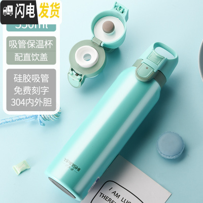 三维工匠儿童保温杯女士带吸管ins可爱清新水杯简约学生大人产妇森系杯子 渐变绿粉吸管保温杯480