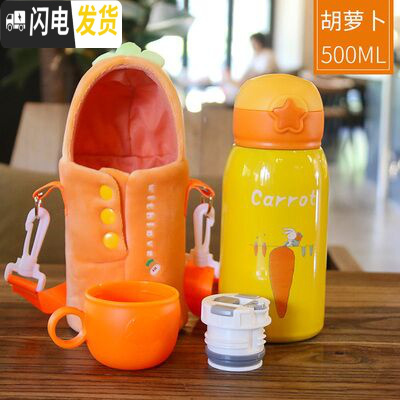三维工匠儿童保温杯带吸管学生316不锈钢水杯斜挎可背水壶 宝宝户外吸管杯 萝卜500双盖送布套