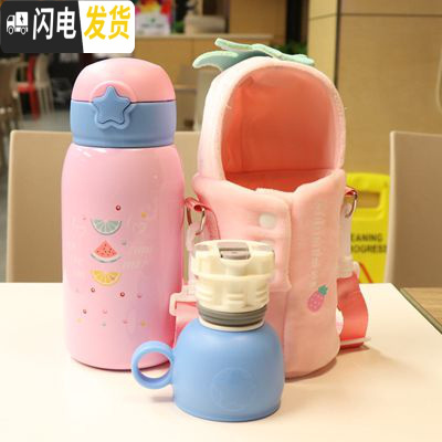 三维工匠儿童保温杯带吸管学生316不锈钢水杯斜挎可背水壶 宝宝户外吸管杯 菠萝500双盖送布套