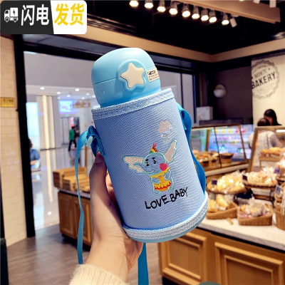 三维工匠可爱斜跨保温杯女带提绳杯子套吸管双盖两用学生儿童便携水杯水壶 蓝色熊布包款500送杯刷+吸管刷