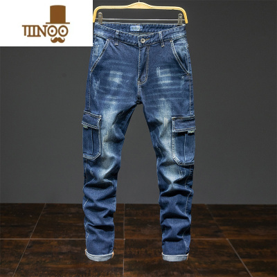 YANXU多口袋弹性蓝色牛仔裤男宽松哈伦小脚显瘦胖子大码百搭工装长裤子