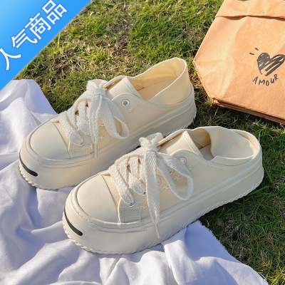 SUNTEK帆布鞋女两穿半拖小白鞋2023新款厚底小众原创设计休闲板鞋