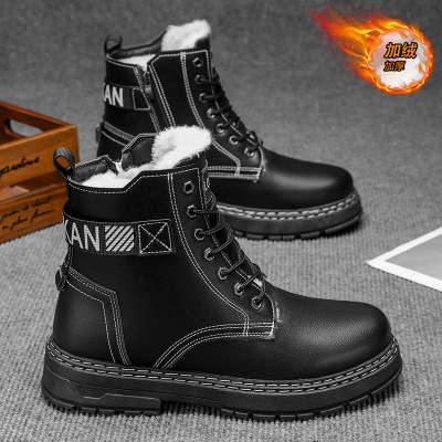 加绒工装马丁靴男冬季保暖雪地靴潮流中高帮男鞋户外防滑复古潮靴