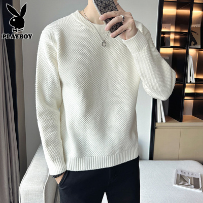 花花公子圆领毛衣男士春季新款潮休闲打底衫白色毛线衣男士针织衫